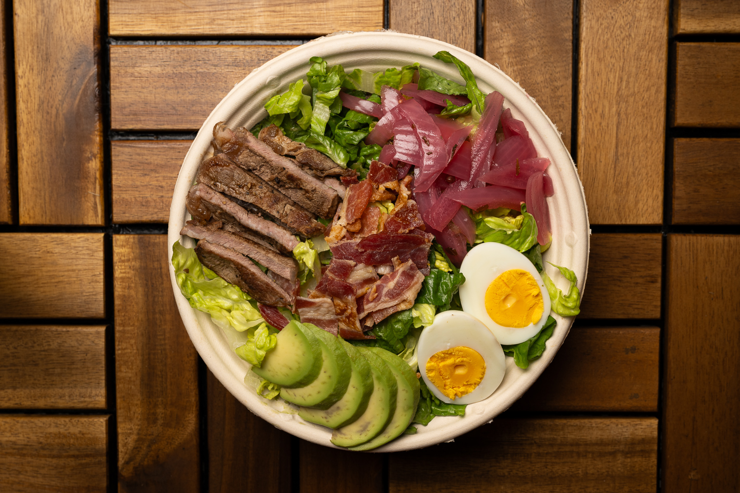 Romaine Lettuce, Pickled Red Onion, Hard Boiled Egg, Avocado, Grilled Flank Steak, Bacon (Contains: Egg)